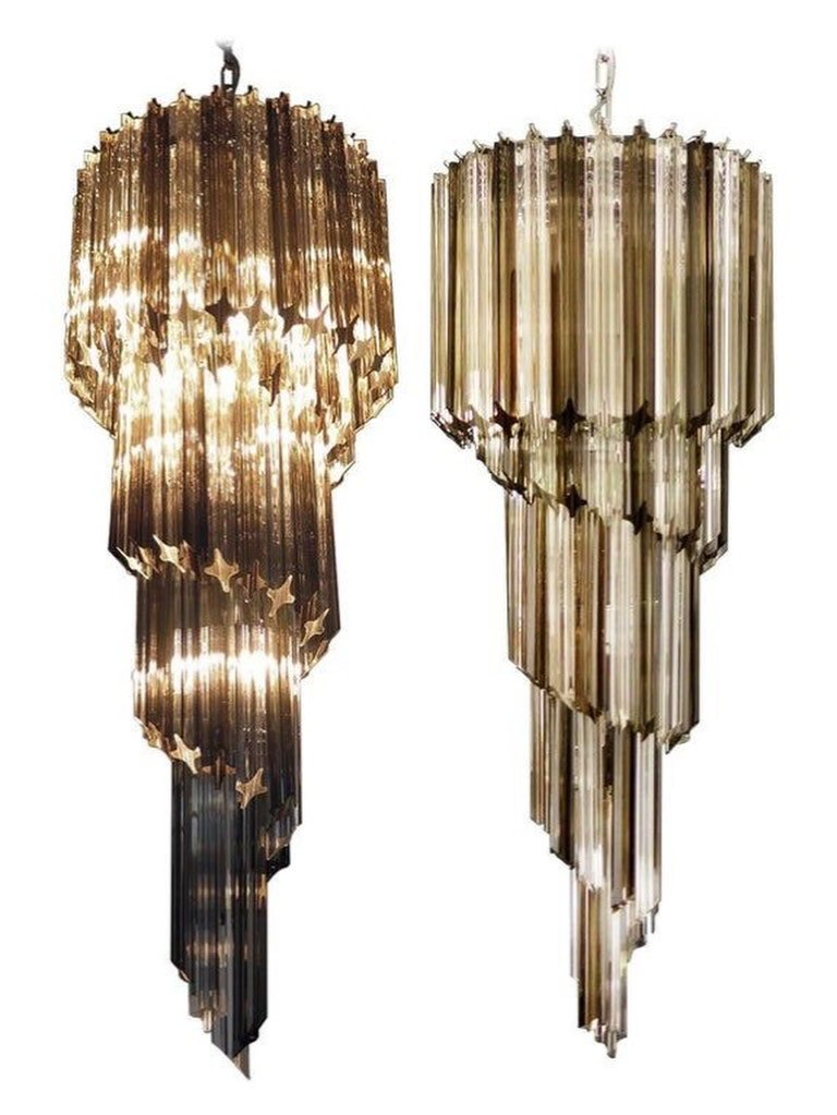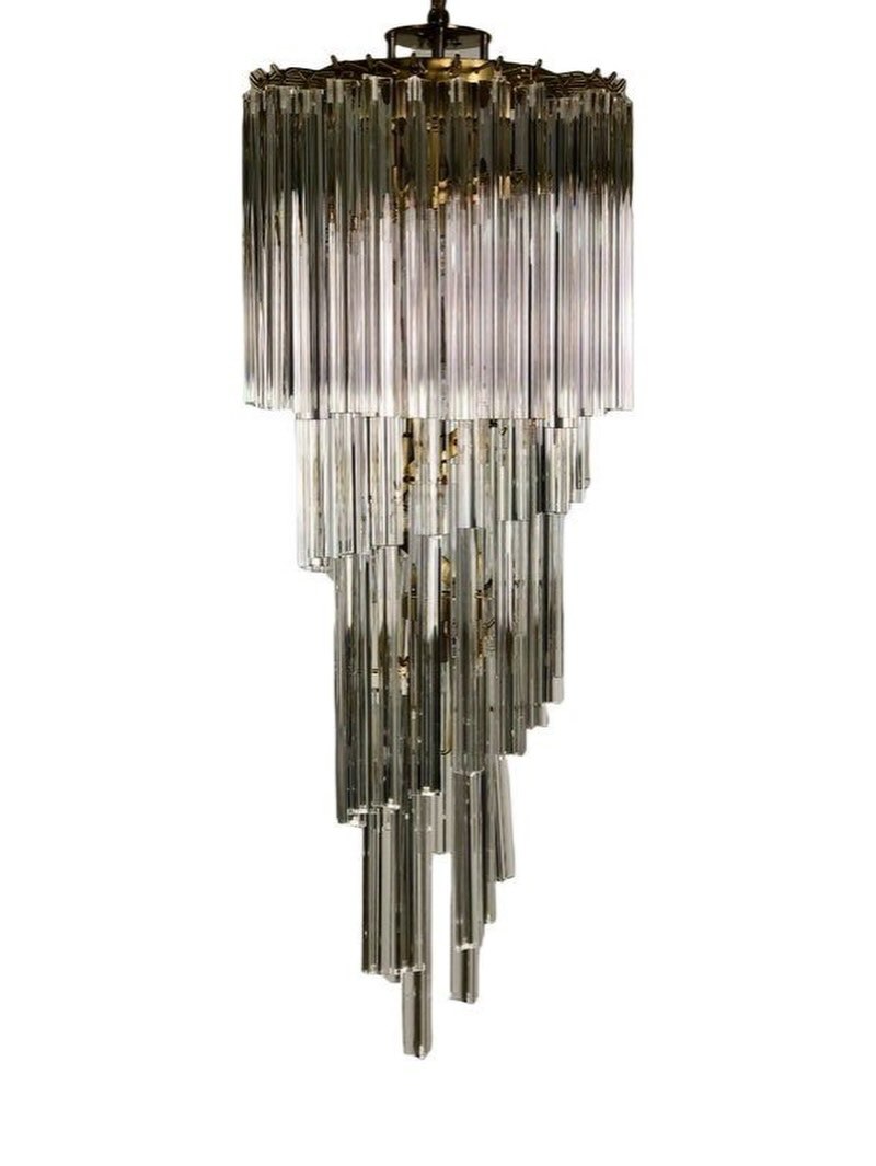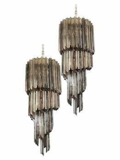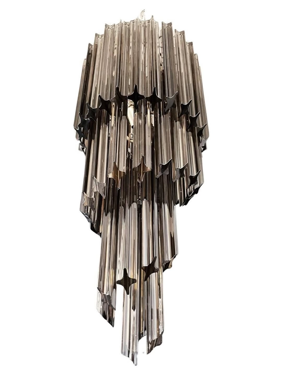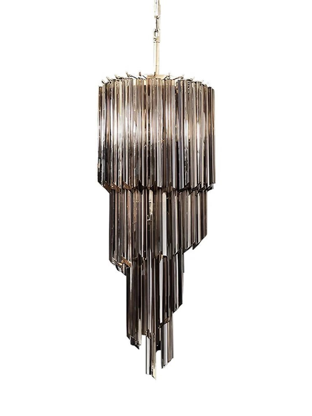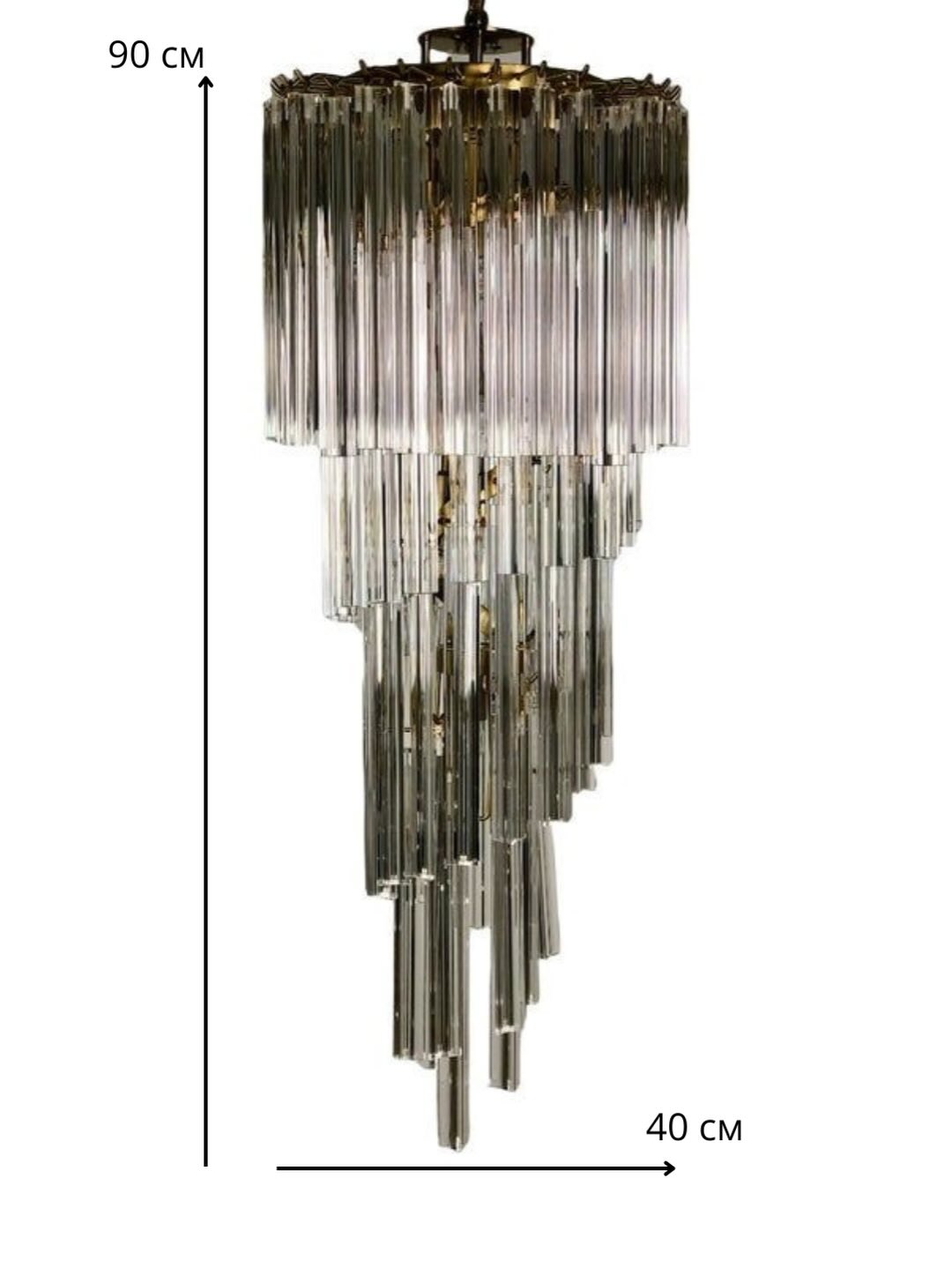 Түтінді көлеңкедегі созылған шыны кулондар каскады бар көз тартарлық аспалы люстра. Жарық пен шағылысу ойыны күн шуақты сән-салтанат атмосферасын жасайды — қонақ бөлме, асхана немесе зал үшін тамаша акцент.