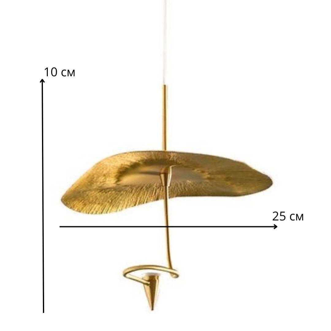 Золотистый металлический диск с текстурой листа создаёт мягкое отражение света, а изящный изогнутый стержень добавляет скульптурности.